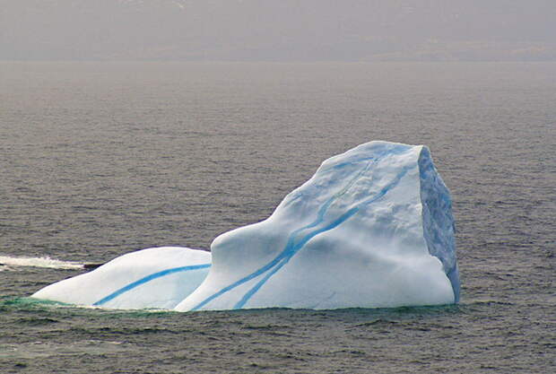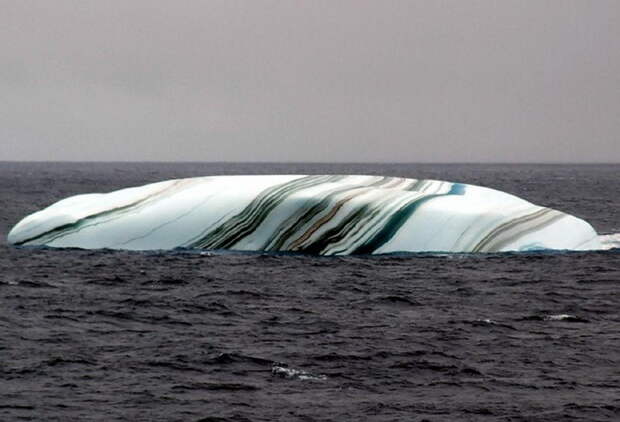 Темные разводы – это пыль и вулканический пепел, которые оседают на айсберге во время его образования. Такие ледники «рождаются» как ледяные шапки на вершинах вулканов, а при их нагревании «сползают» в воду.